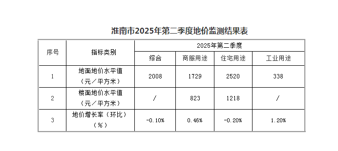 【地价动态】淮南市2025年度地价动态监测第2季度数据