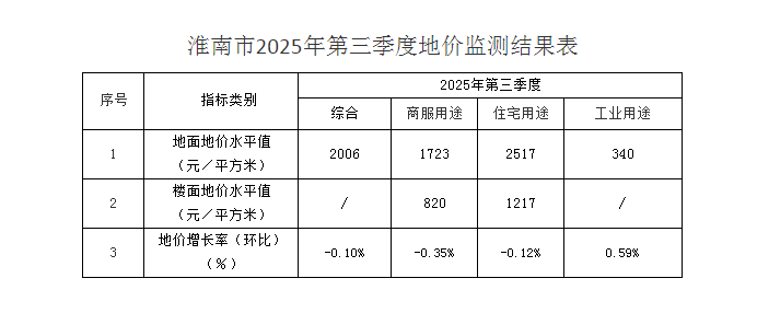 【地价动态】淮南市2025年度地价动态监测第3季度数据