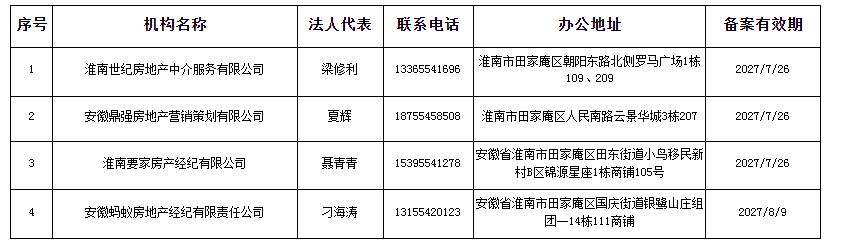 为规范房地产中介市场,保护房地产交易及经济活动当事人合法权益,促进房地产市场健康发展,根据《房地产经纪管理办法》和淮住房联〔2019〕137号《关于加强房地产经纪机构管理的实施意见》要求,现将我市2025年房地产经纪机构备案情况进行公示。请广大房地产交易当事人在进行交易时审慎选择经备案的房地产经纪机构,提高风险防范意识。监督电话:0554-6887255
