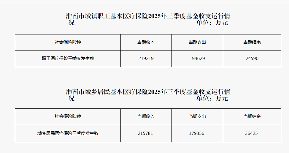 淮南市城镇职工、城乡居民基本医疗保险2025年三季度基金收支运行情况