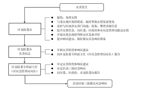 灾害发生后,区安防委办经分析评估,认定灾情达到启动标准,区安防委专职副主任(区应急管理局局长)决定启动三级响应,并向区委、区政府和市安防委办报告。