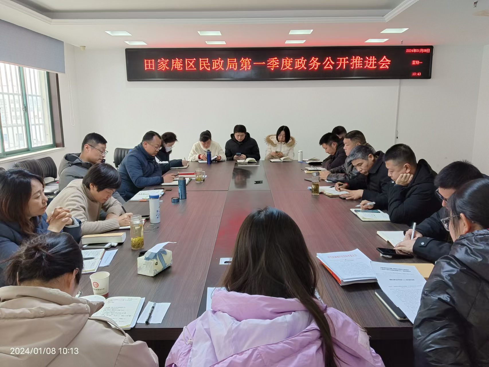 1月8日,区民政局召开2024年第一季度政务公开工作推进会议。会上,传达学习了省政务公开办《2024年政务公开重点工作清单》,传达了市政务公开讲评会会议精神,对我单位存在问题进行了提示、分析了原因、提出了整改意见,对当前和全年政务公开重点目标任务进行了部署。