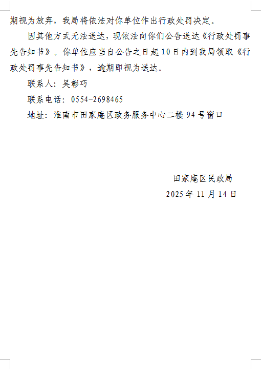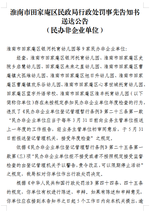淮南市田家庵区民政局行政处罚事先告知书送达公告