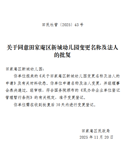 关于同意田家庵区新城幼儿园变更名称及法人的批复