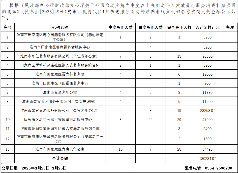 田家庵区2026年1月向中度以上失能老年人发放养老服务消费