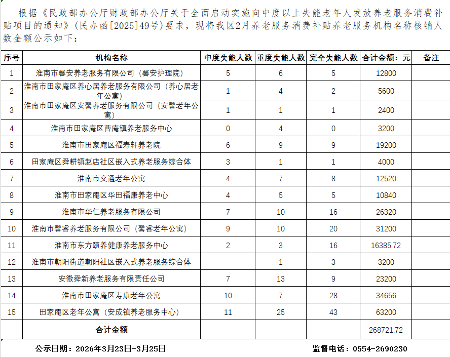 田家庵区2026年2月向中度以上失能老年人发放养老服务消费