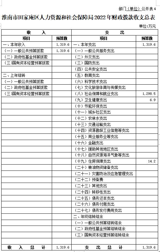 4.淮南市田家庵区人力资源和社会保障局2022年财政拨款收支总表