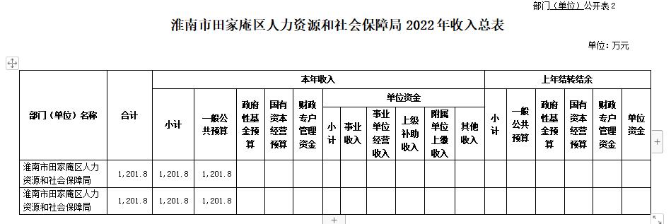淮南市田家庵区人力资源和社会保障局2022年收入预算1201.8万元,其中,本年收入1201.8万元,上年结转结余0万元。