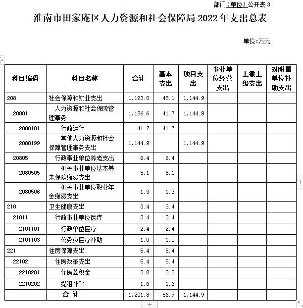 按照综合预算的原则,淮南市田家庵区人力资源和社会保障局所有收入和支出均纳入单位预算管理。淮南市田家庵区人力资源和社会保障局2022年收支总预算1201.8万元,收入全部是一般公共预算拨款收入,支出包括:社会保障和就业支出、卫生健康支出、住房保障支出。