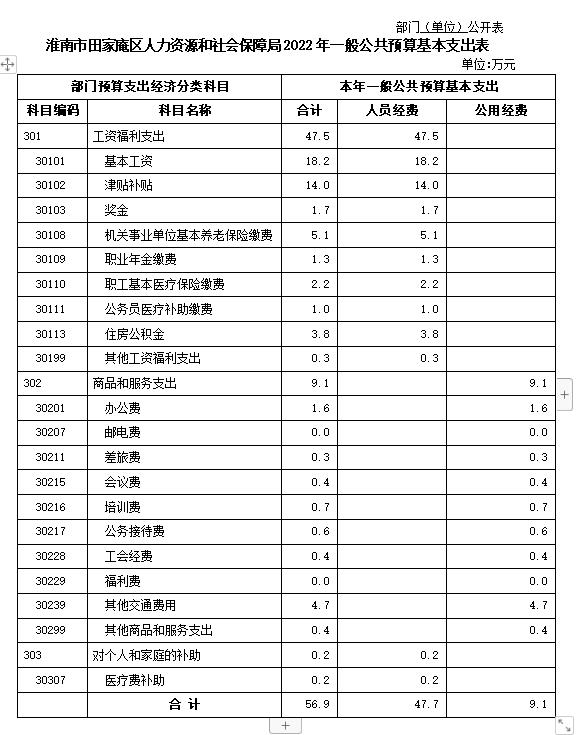 淮南市田家庵区人力资源和社会保障局2022年一般公共预算基本支出56.9万元,其中,人员经费47.7万元,公用经费9.1万元。