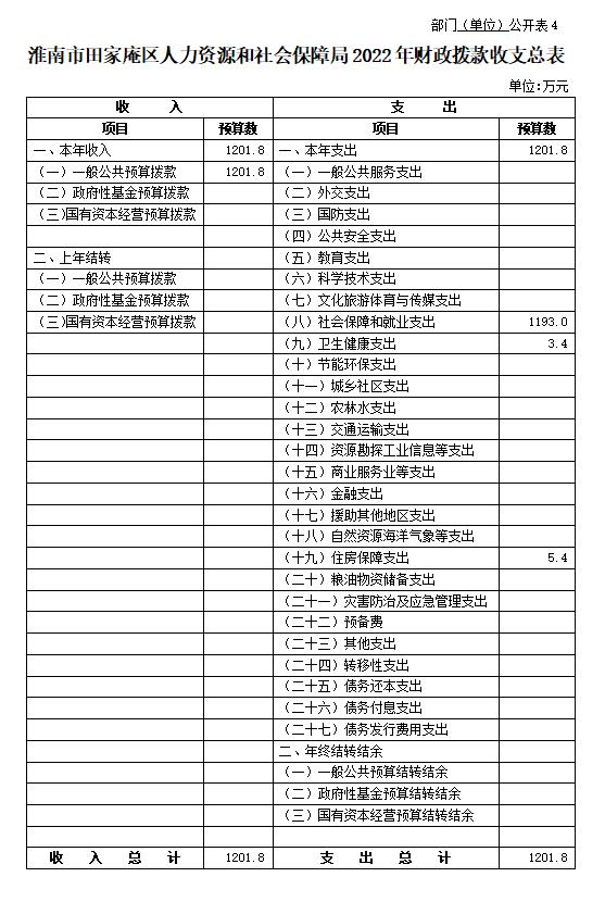 4.淮南市田家庵区人力资源和社会保障局2022年财政拨款收支总表