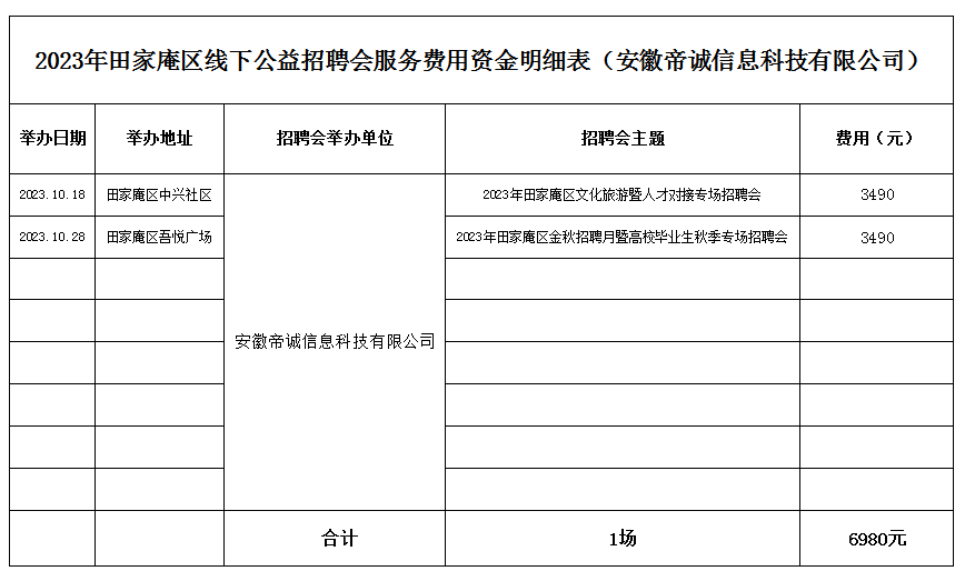 2023年田家庵区线下公益招聘会服务费用资金明细表(安徽帝诚信息科技有限公司)