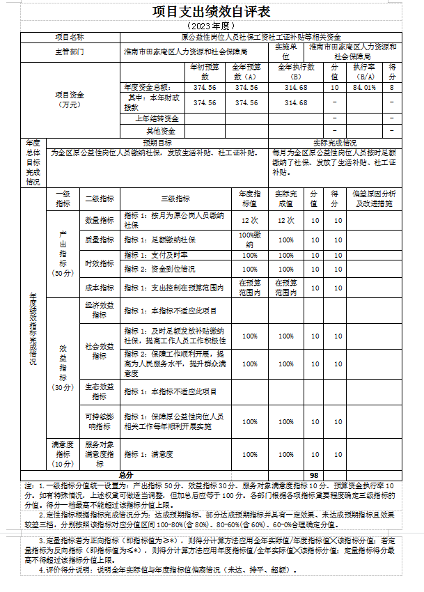 原公益性岗位人员社保工资社工证补贴等相关资金项目绩效自评综述:根据年初设定的绩效目标,项目绩效自评得分为98分。全年预算数为374.56万元,执行数为314.68万元,完成预算的84.01%。项目绩效目标完成情况:一是每月按规定足额为全区原公益性岗位人员缴纳社保、发放生活补贴、社工证补贴;二是及时发放补贴、按规定调整社保基数,及时缴纳社保,提高工作人员积极性。 发现的主要问题及原因:编制项目预算时预留社保基数调整及补贴增加的空间较大,预算执行率不够高。下一步改进措施:2024编制项目预算时尽量压减预算资金预留空间。