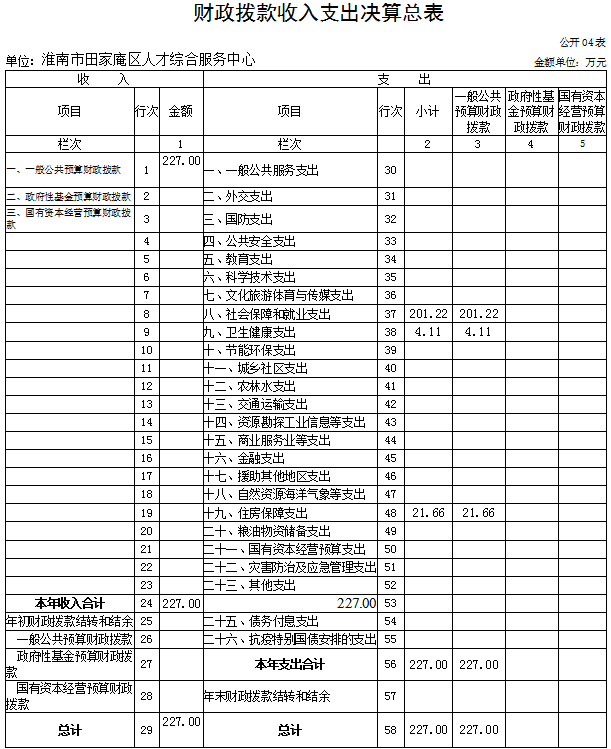 2024年度财政拨款收入总计227万元(含年初财政拨款结转和结余),支出总计227万元(含年末财政拨款结转和结余)。与2023年相比,财政拨款收、支总计各增加93.2万元,增长69.66%,主要原因:一是人员工资上涨;二是上级资金就业补助资金下达。