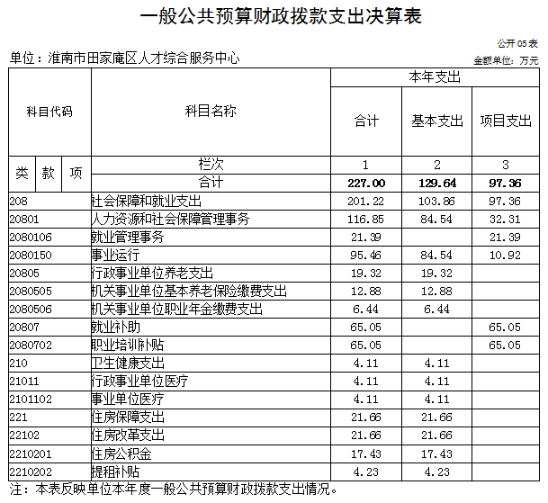 2024年度一般公共预算财政拨款支出227万元,占本年支出100%。与2023年相比,一般公共预算财政拨款支出增加93.2万元,增长69.66%,主要原因:一是人员工资上涨;二是上级资金就业补助资金下达。