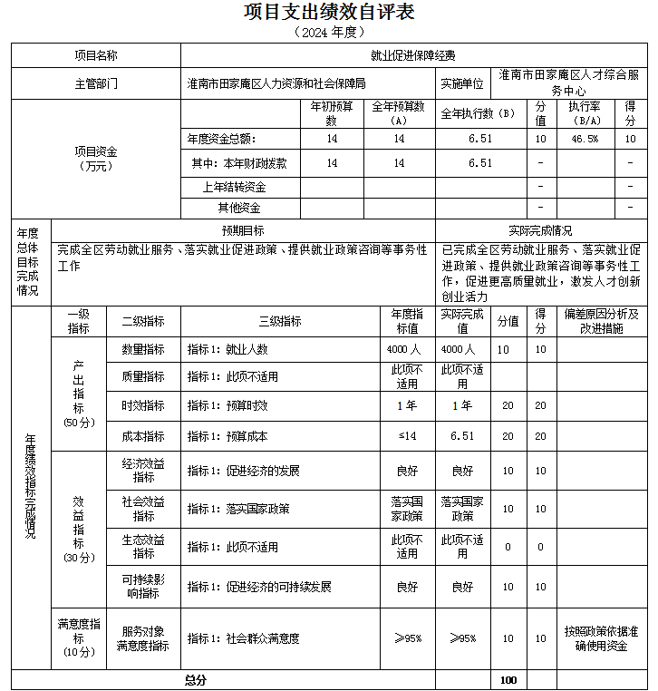 2024年行政运行项目绩效自评综述:根据年初设定的绩效目标,项目绩效自评得分为80分。全年预算数为14万元,执行数为6.51万元,完成预算的41.5%。项目绩效目标完成情况:有偏差,偏差原因:缩减财政开支,满足单位基本运转,通过项目实施,弥补公用经费预算支出,保障就业事务正常开展。下一步改进措施:加大预算执行力度,合理整合调整预算支出。
