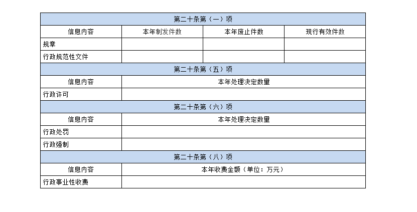 各行政机关年度报告格式模板附后。此前有关政府信息公开的各类报告和统计口径,随原政府信息公开条例的失效而失效。政府信息公开工作主管部门负责汇总的本级政府年度报告格式,参照这一格式模板办理。党的工作机关加挂行政机关牌子的单位,年度报告内容依据全国政府信息公开工作主管部门发布的有关规定(国办公开办函〔2019〕51号)确定,并参照这一格式模板办理。