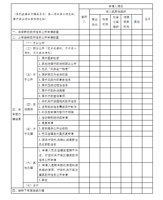 这一项主要报告两方面情况:一是申请人的类别;二是政府信息公开申请的最终处理结果。此项内容重在数据准确、要素齐备,全面客观反映政府信息公开申请接收和办理情况,便于政府信息公开工作主管部门全面掌握工作动态,使社会各界了解政府公开透明进程。