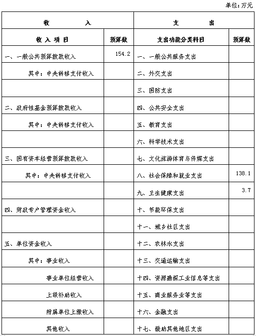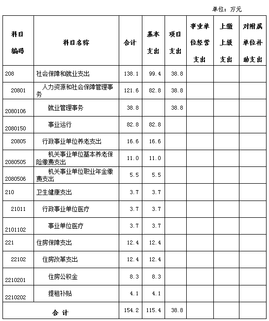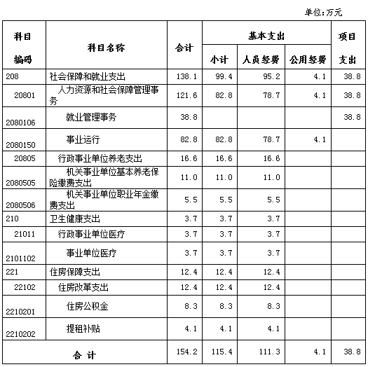 社会保障和就业支出138.1万元,占89.6%;卫生健康支出3.7万元,占2.4%;住房保障支出12.4万元,占8%。