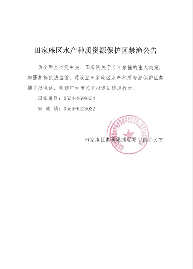 | 名称: | 田家庵区水产种质资源保护区禁渔公告 |