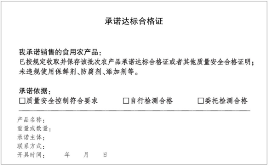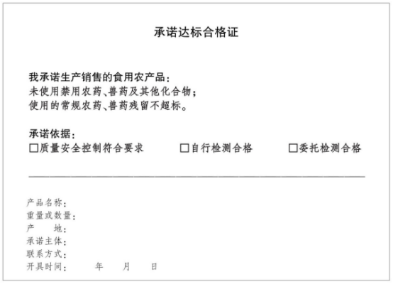 承诺达标合格证是指农产品生产企业、农民专业合作社、农户和从事农产品收购的单位或者个人,根据质量安全控制、检测结果等依法开具,承诺其销售的农产品未使用禁用农药、兽药及其他化合物且使用的常规农药、兽药残留不超标等的证明。