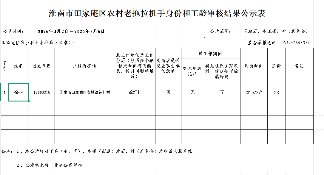 淮南市田家庵区农村老拖拉机手身份和工龄审核结果公示表