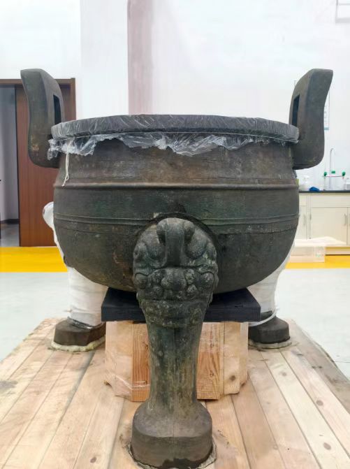 备受关注的武王墩墓墓主随葬重器——大铜鼎,于5月18日从一号墓东一室成功提取。当前,它正安放在考古实验室内,接受考古专家的“号脉问诊”和保护研究。
