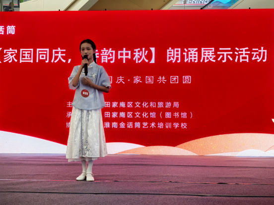 为庆祝国庆、欢度中秋,弘扬爱国主义精神,传递团圆和谐的家庭观念,由田家庵区文化和旅游局主办,田家庵区文化馆(图书馆)承办,淮南金话筒艺术培训学校协办的“家国同庆 诗韵中秋”朗诵展示活动9月27日下午在淮南万达广场隆重举行。