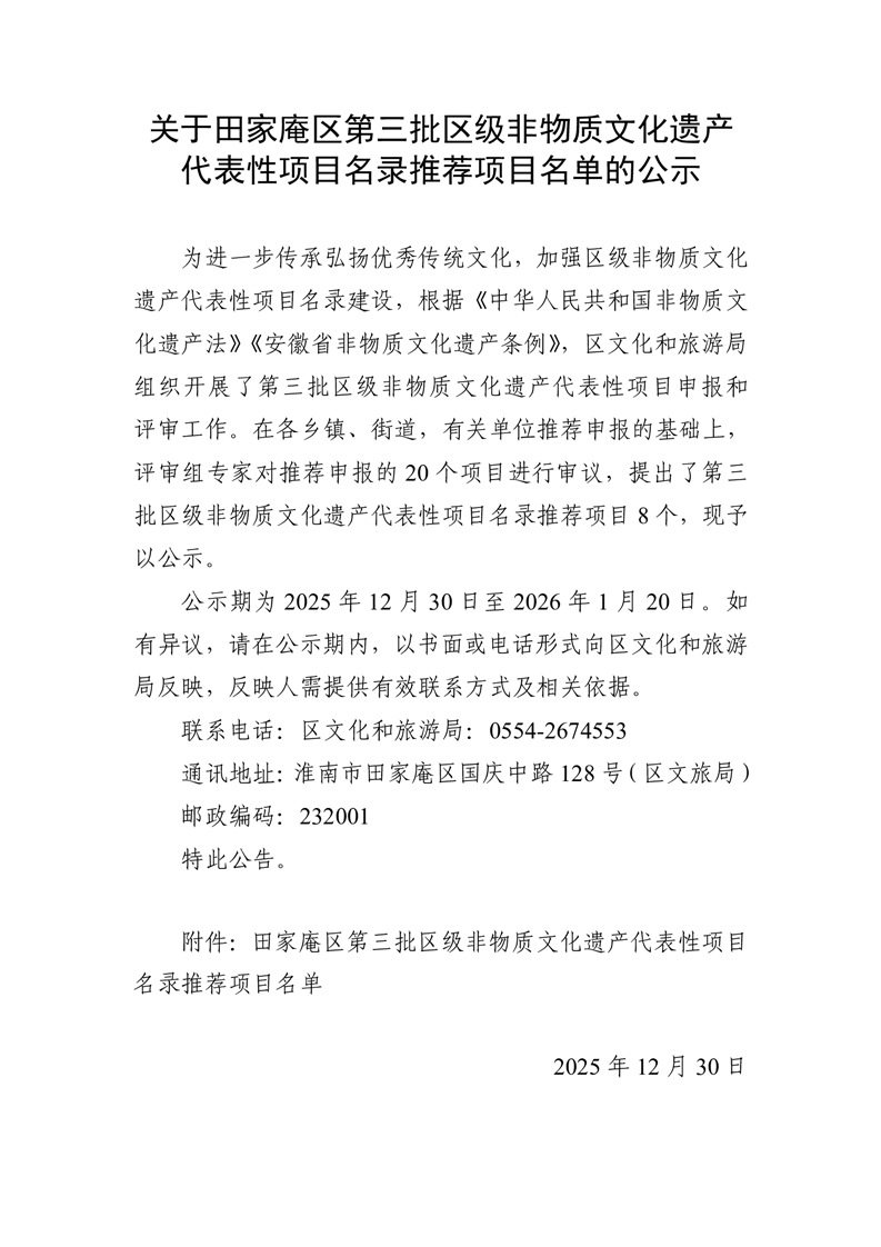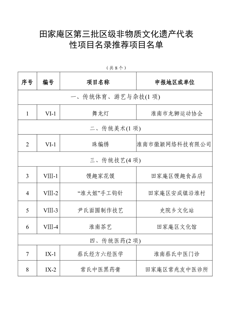 关于田家庵区第三批区级非物质文化遗产代表性项目名录推荐项目名单的公示