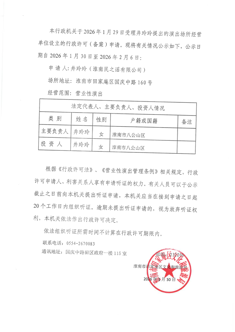 关于淮南民之谣有限公司申请《经营性演出许可》的公告