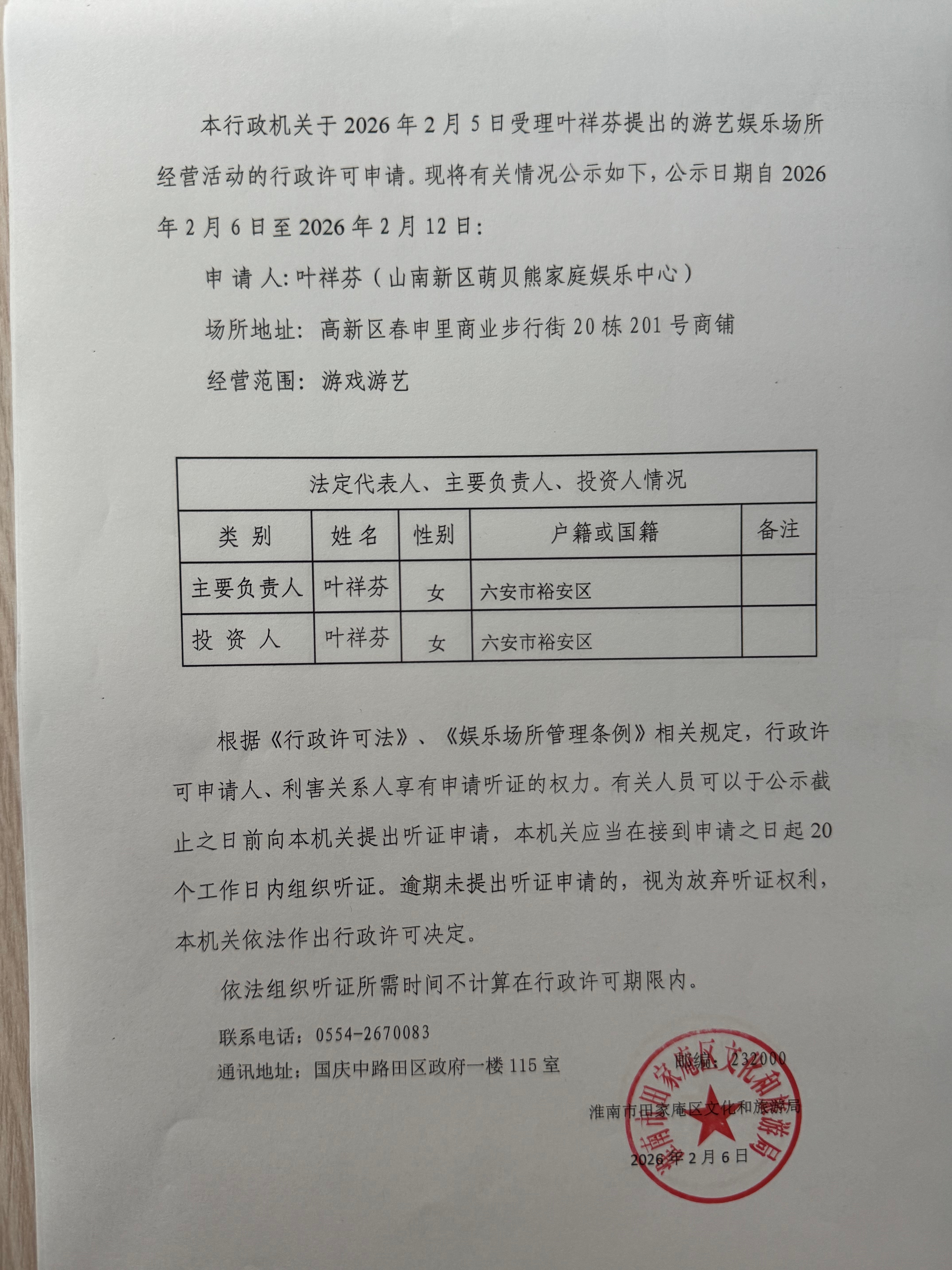 关于叶祥芬申请《游艺娱乐场所经营许可》的公告