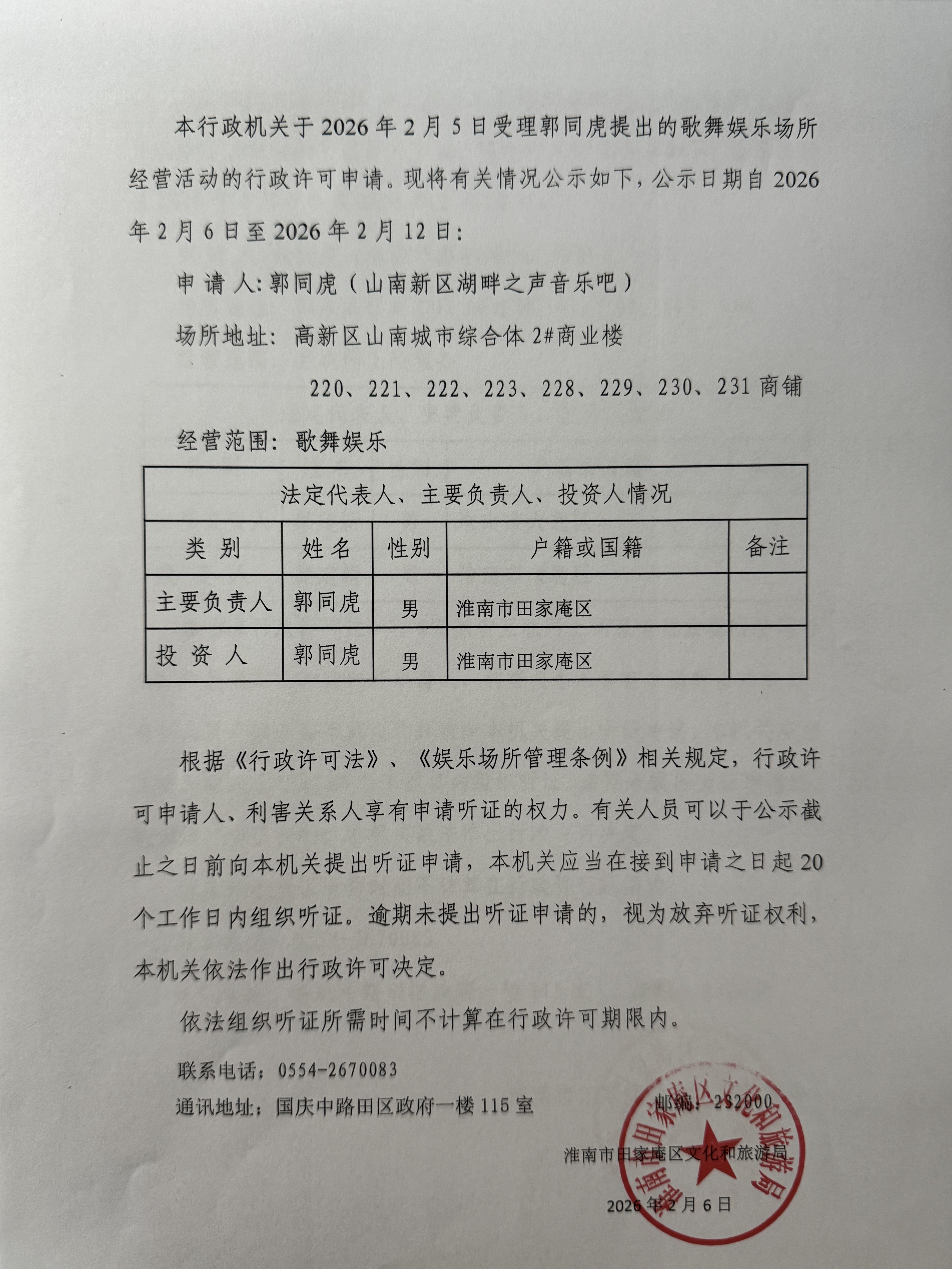 关于郭同虎申请《歌舞娱乐场所经营许可》的公告