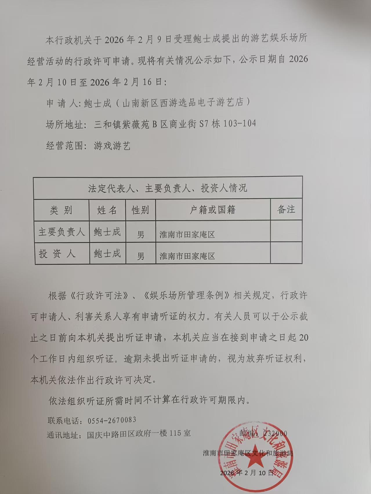 关于鲍士成申请《娱乐场所经营许可》的公告