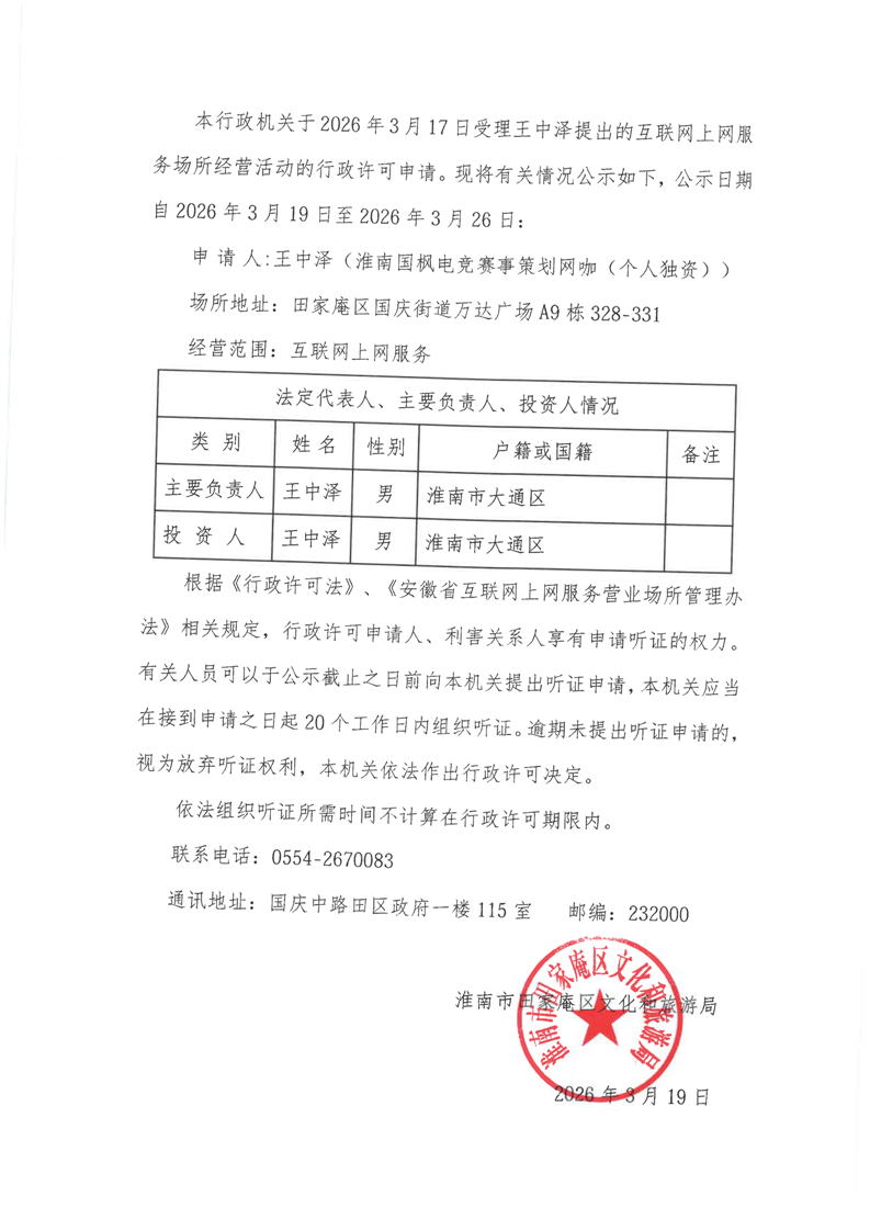 关于王中泽申请互联网上网服务场所经营行政许可的公告