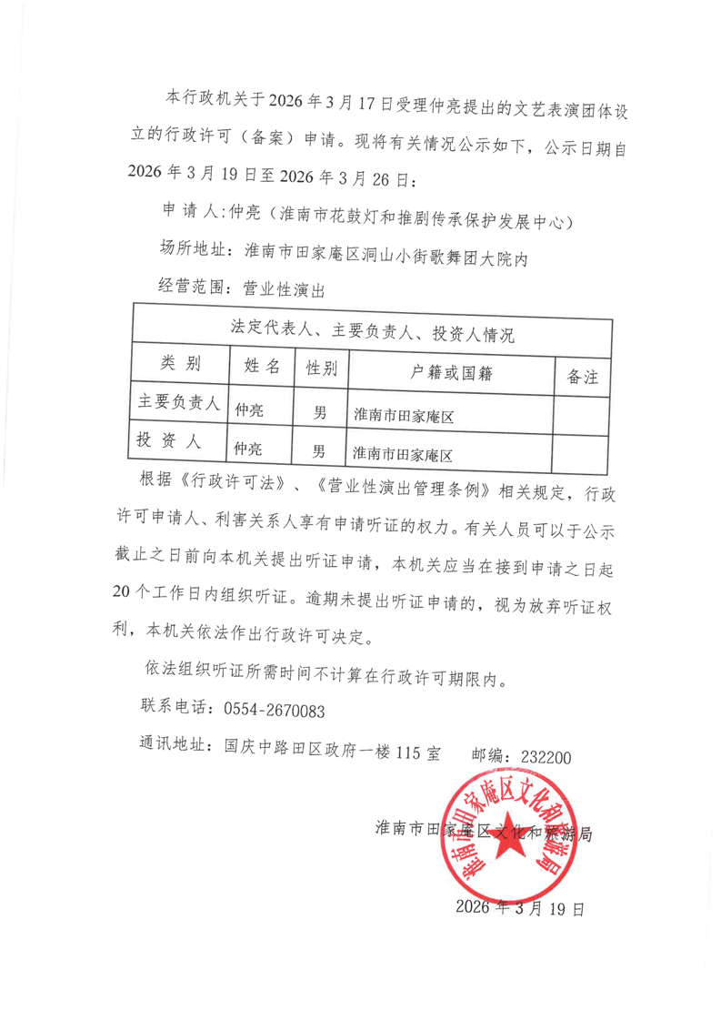 关于仲亮申请文艺表演团体设立行政许可的公告