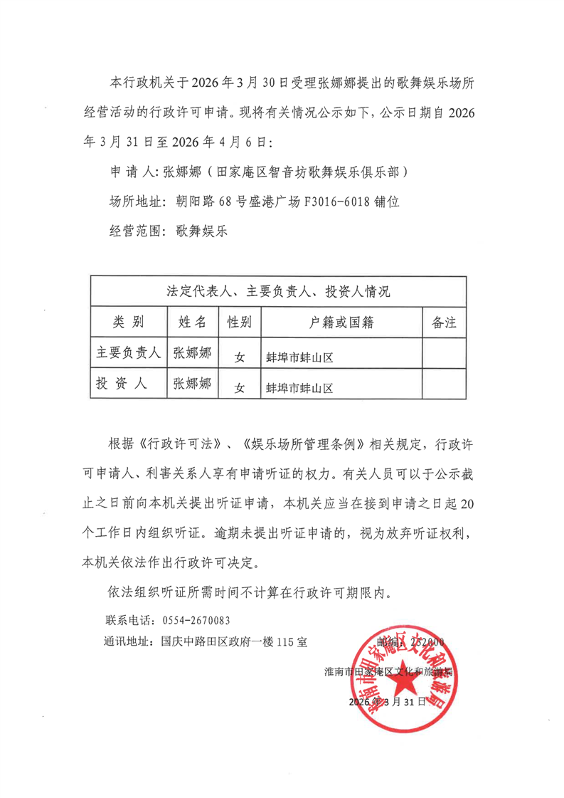 关于张娜娜申请歌舞娱乐场所行政许可的公告