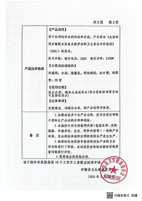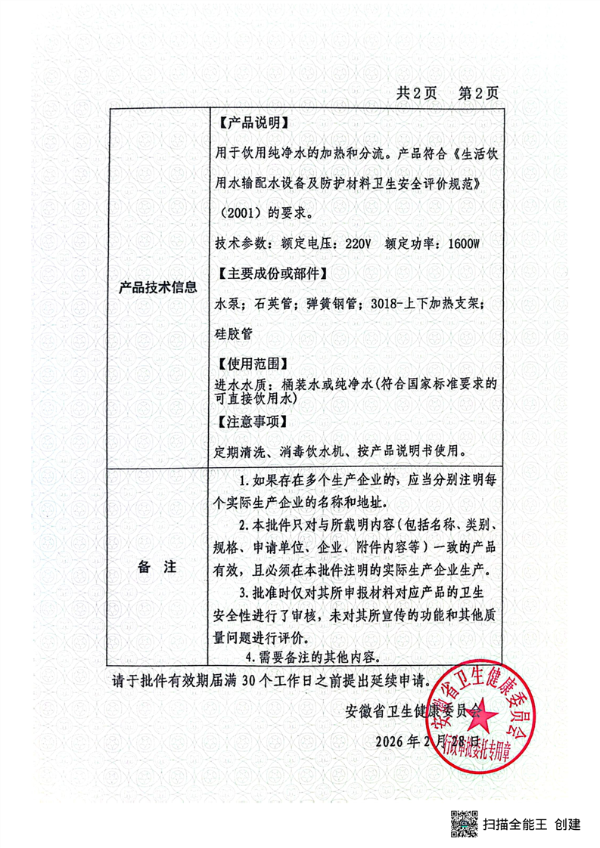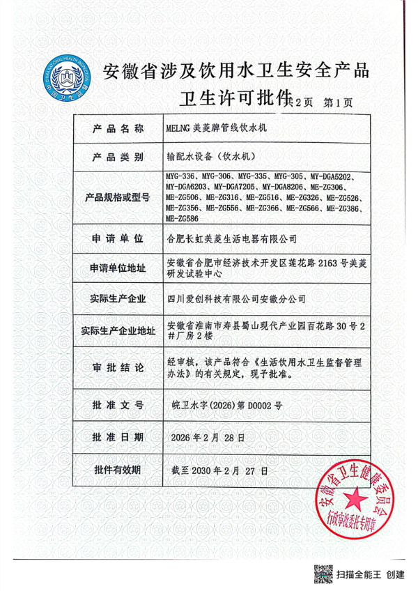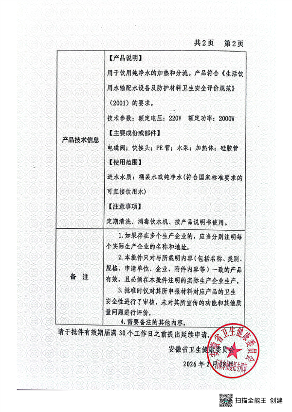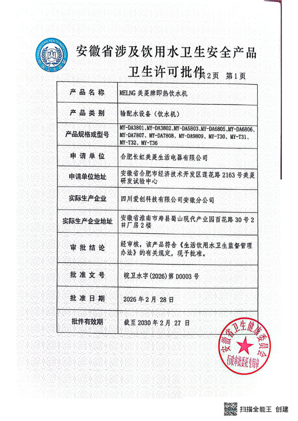 安徽省涉及饮用水卫生安全产品卫生许可批件