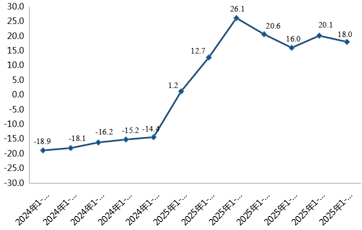 制造业增速回落明显。2025年1-8月份,全区规模以上工业制造业同比下降2.4%,与前七个月相比降幅扩大0.5个百分点,与去年同期相比下降11.2个百分点,拉动全区工业经济下降0.8个百分点。在全区23个工业大类行业中,10个行业呈现下降态势,下降面达43.5%。其中,降幅较大的三个行业为木材加工和木、竹、藤、棕、草制品业、造纸和纸制品业、化学原料和化学制品制造业,分别下降57.9、57.8、53%,合计下拉全区工业负增长3.5个百分点。