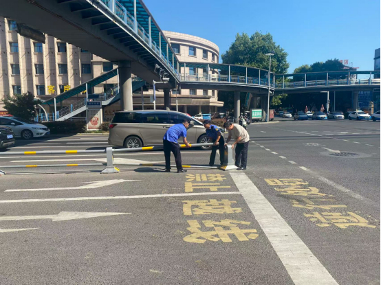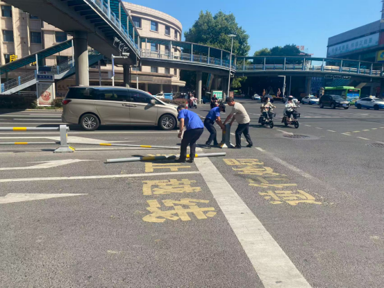 某日,朝阳中队在日常巡查过程中,发现淮河大道与朝阳西路因发生车祸马路护栏倒塌,倒塌的隔离栏占据了一侧车道,对过往车辆和行人构成了安全隐患。执法队员立即报送现场情况,呼叫附近路段队员支援协助,移除了马路中间破损护栏,并提醒过往车辆和行人注意避让,防止发生二次事故。事后,朝阳中队积极对接市政部门,对路段护栏进行维修处理。