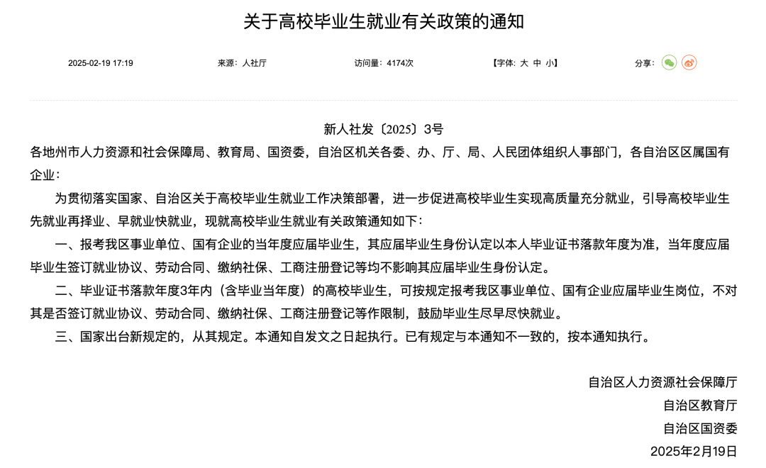 通知表示,报考自治区事业单位、国有企业的当年度应届毕业生,其应届毕业生身份认定以本人毕业证书落款年度为准,当年度应届毕业生签订就业协议、劳动合同、缴纳社保、工商注册登记等