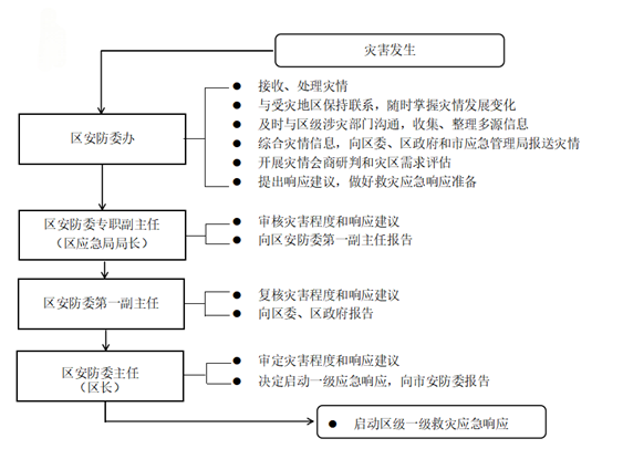 灾害发生后,区安防委办经分析评估,认定灾情达到启动标准,向区安防委提出启动一级响应的建议,按照区政府决定,启动一级响应,并向市安防委报告。