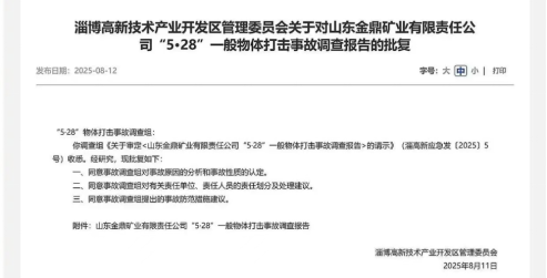 8月12日,山东淄博高新技术产业开发区管委会对外公布《淄博高新技术产业开发区管理委员会关于对山东金鼎矿业有限责任公司“5·28”一般物体打击事故调查报告的批复》(以下简称《批复》)。