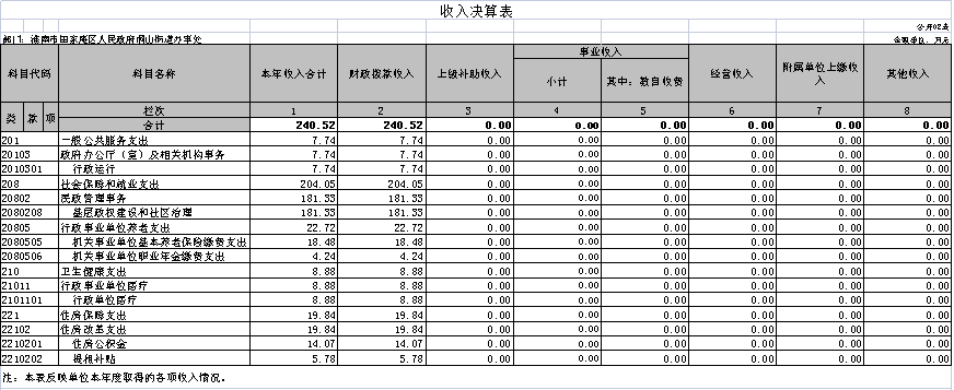 2022年度收入合计240.52万元,其中:财政拨款收入240.52万元,占100%;事业收入0万元,占0%;经营收入0万元,占0%;其他收入0万元,占0%。