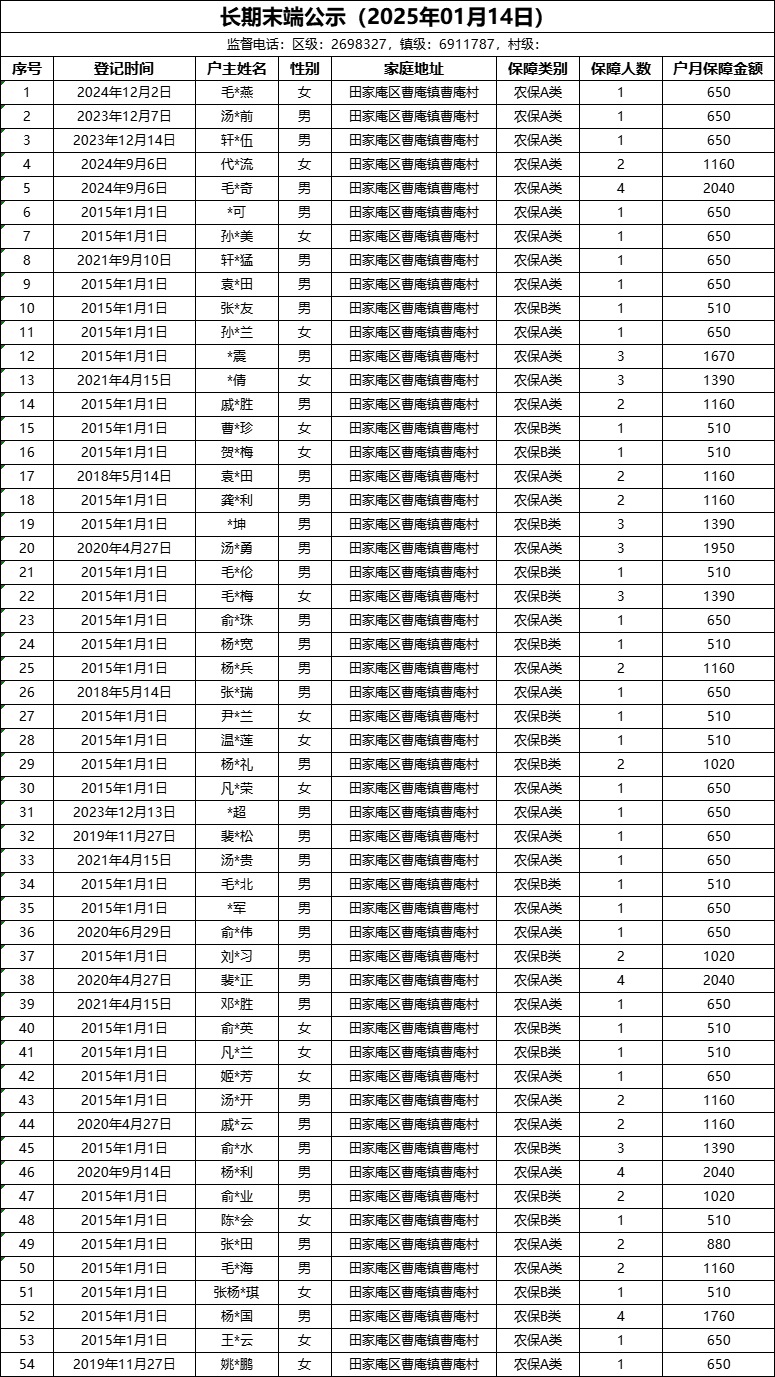 曹庵镇2025年1月五保人员名单公示