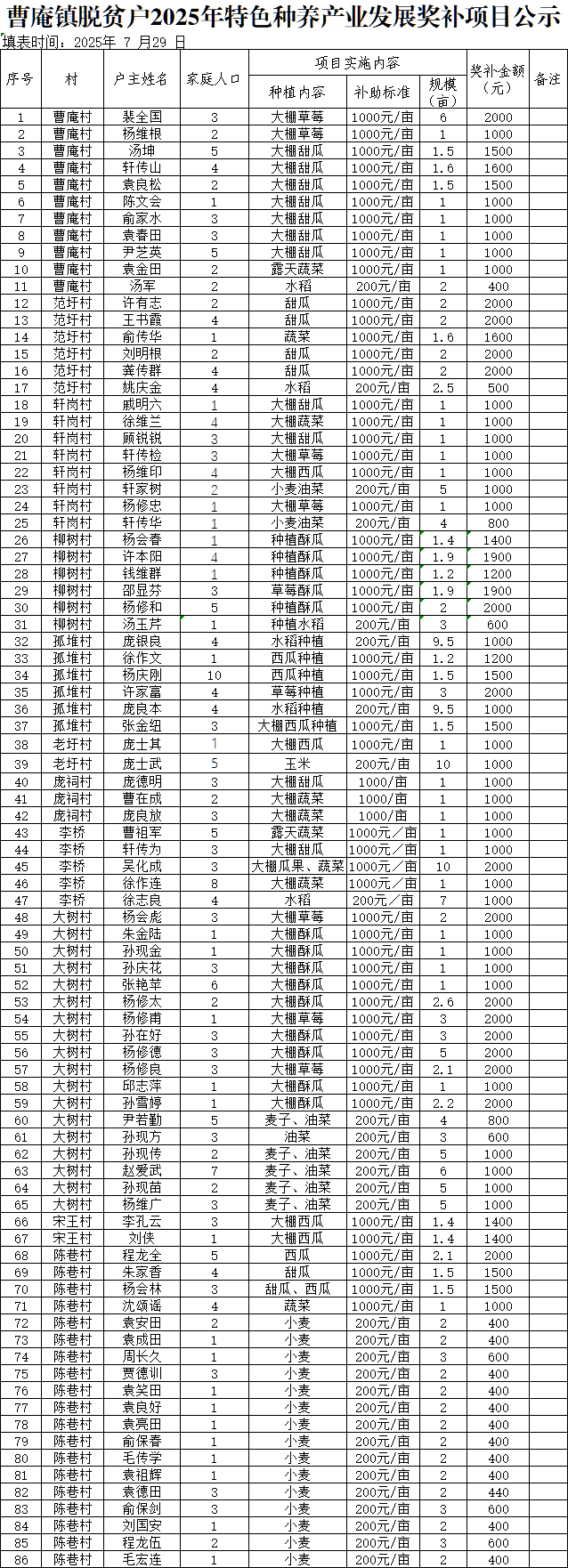 曹庵镇脱贫户2025年特色产业发展奖补项目实施情况公示