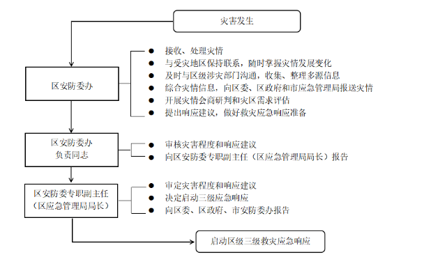 灾害发生后,区安防委办经分析评估,认定灾情达到启动标准,区安防委专职副主任(区应急管理局局长)决定启动三级响应,并向区委、区政府和市安防委办报告。