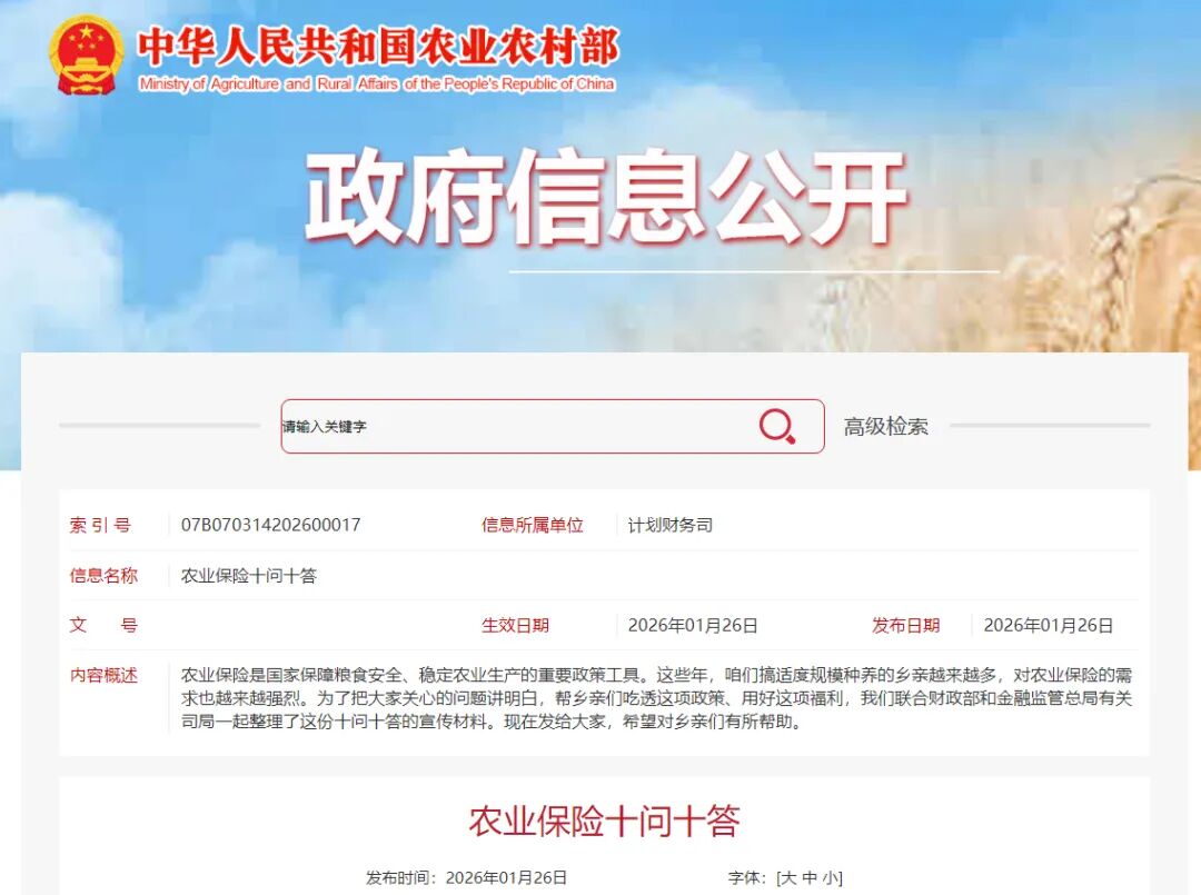 农业保险是国家保障粮食安全、稳定农业生产的重要政策工具。这些年,咱们搞适度规模种养的乡亲越来越多,对农业保险的需求也越来越强烈。为了把大家关心的问题讲明白,帮乡亲们吃透这项政策、用好这项福利,我们联合财政部和金融监管总局有关司局一起整理了这份十问十答的宣传材料。现在发给大家,希望对乡亲们有所帮助。