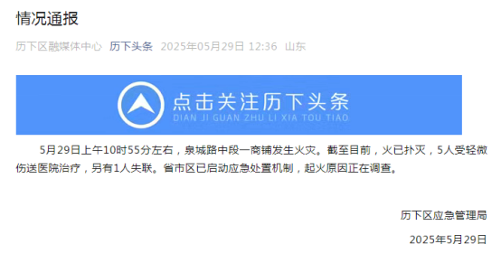 据山东济南市历下区应急管理局消息,5月29日上午10时55分左右,山东济南泉城路中段一商铺发生火灾。