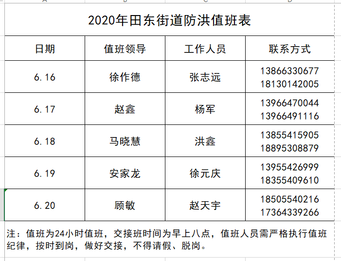 【对应情况】2020年田东街道防洪值班表