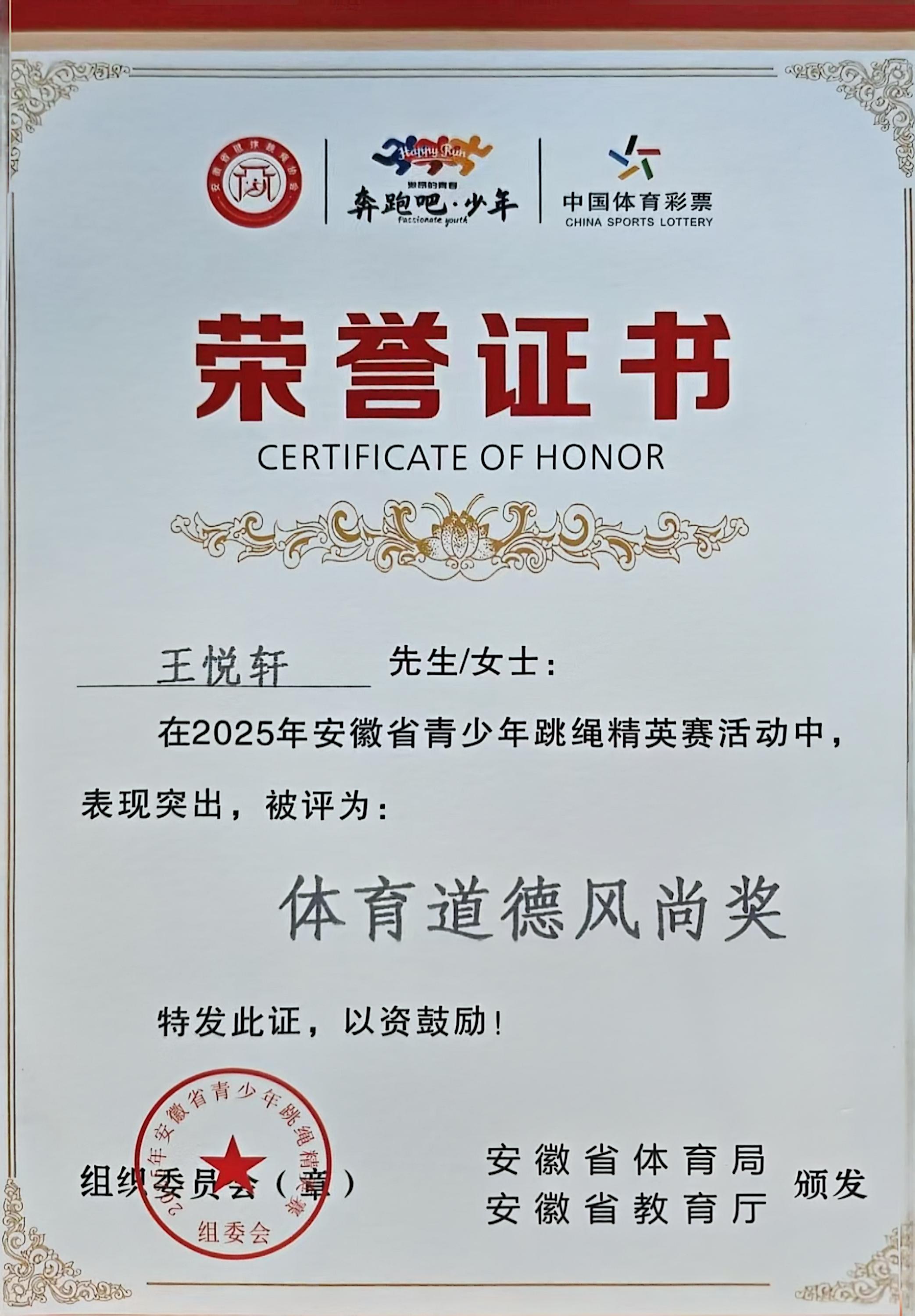 近日,在安徽省教育厅、安徽省体育局联合主办的2025年安徽省跳绳精英赛中,我校六(3)班学生王悦轩同学,凭借扎实的功底、灵动的身姿与稳定的发挥脱颖而出,斩获本次比赛三等奖!